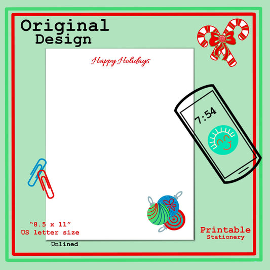 Happy Holidays Ornaments Printable Stationery Journal Writing Notetaking Lined and Unlined