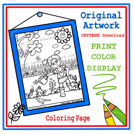 Flowers Springtime Coloring Page Girl Watering Flowers Party Activity for Kids at Home or School