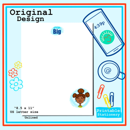 Printable Inspirational Stationery Dream Big Happy Girl Lined & Unlined US Letter Size Motivational Writing Paper PDF