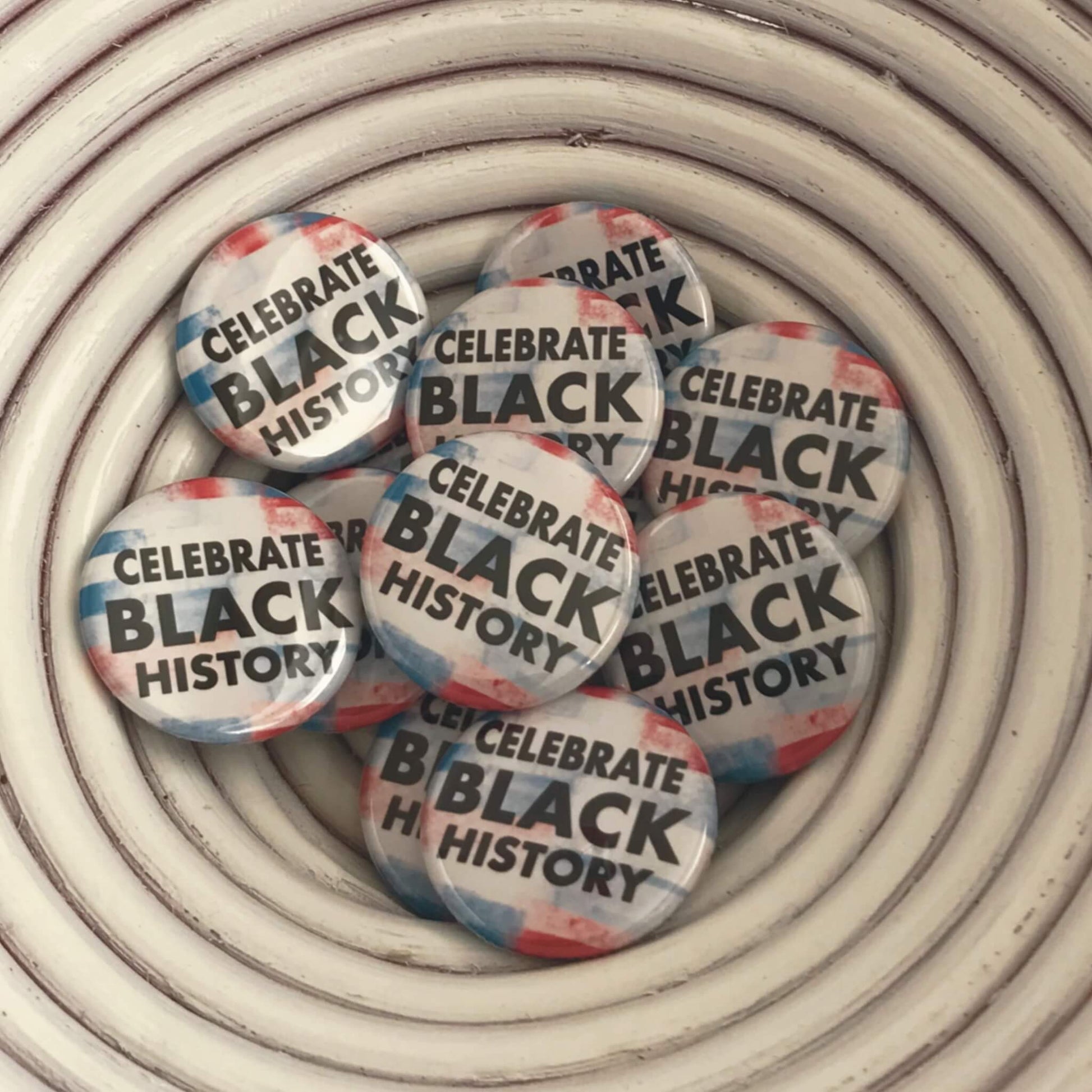 Black History Matters. This pinback button has the words CELEBRATE BLACK HISTORY on a red, white, and blue patchwork background. It represents the building blocks to freedom. And the continued fight for justice and equality for all Americans.