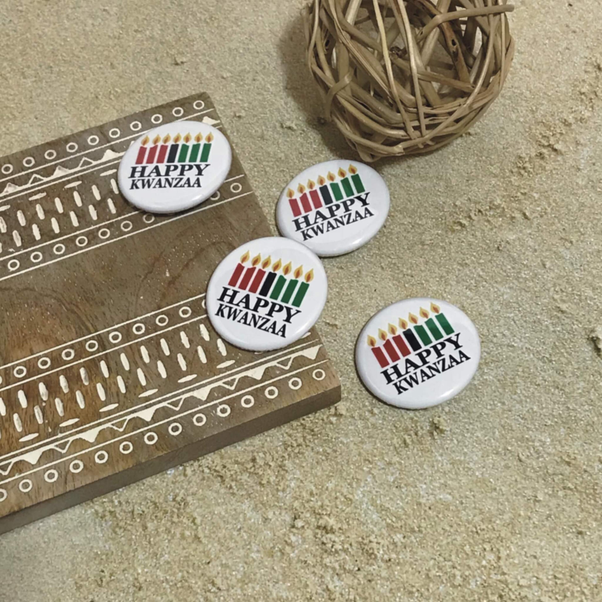 Celebrate Kwanzaa holiday with our pinback button. A great way to express your appreciation for your amazing culture, family, and community during the holiday season. Share the joy of giving, self-determination, and togetherness with family and friends with our Kwanzaa badges.