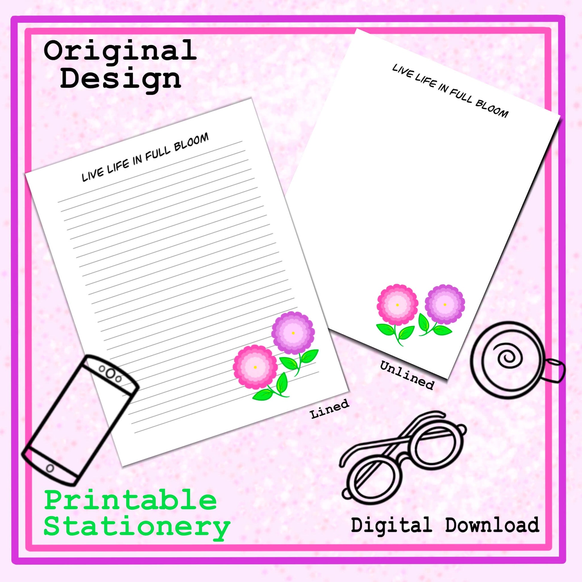 Your download will include 2 high quality (300dpi resolution) printable stationery pages with original artwork on lined and unlined sheets in 1 PDF file.