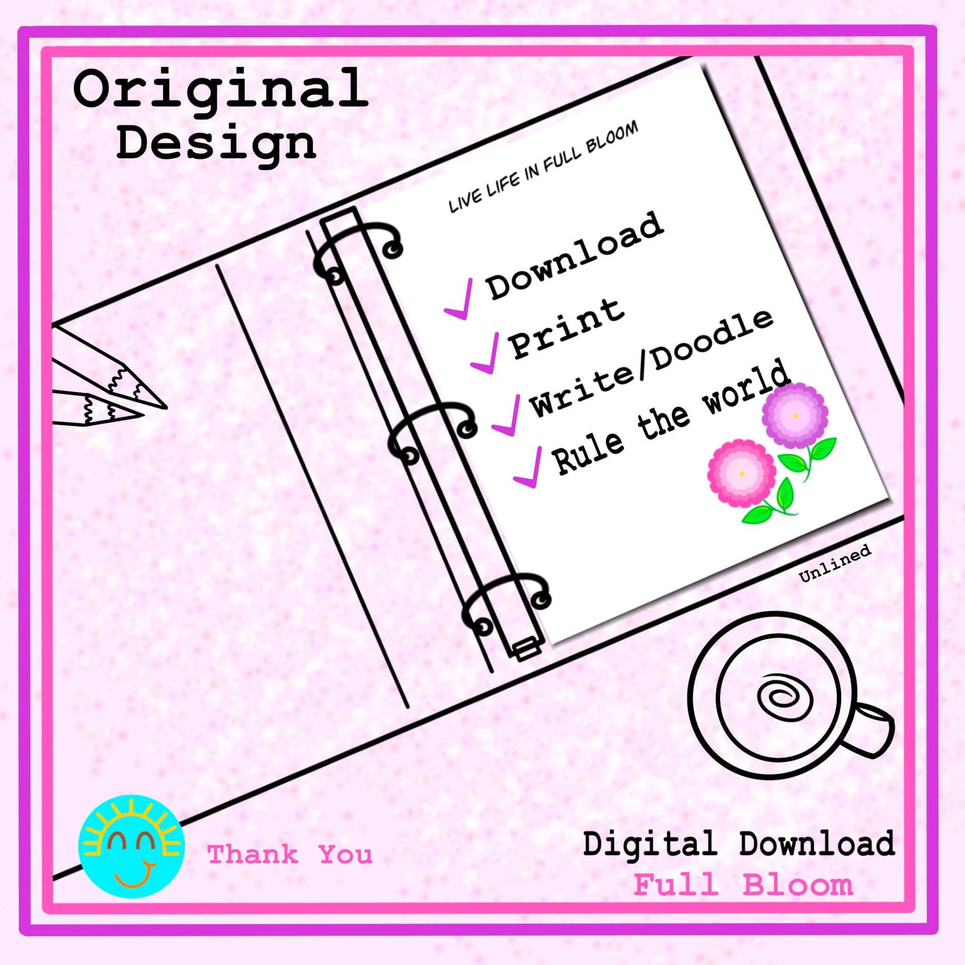 Capture your thoughts with our beautifully designed printable stationery. The inspirational quote, “Live life in full bloom” is at the top of the page and two colorfully designed flowers are at the bottom of the sheet. The lined sheet is a wonderful way to express yourself via creative journaling or doodling on our unlined sheet. Space has been left for 3 holes or more so that our 8.5 x 11-inch pages can be easily added to just about any notebook. These adorable writing sheets are ideal for all ages. Looking for more ways to express yourself, check out all our digital products, today.