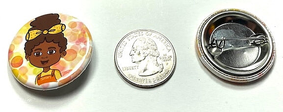 This pin button shows a cute African American girl with the word SMART on her overalls. She is surrounded by brightly colored orange, yellow, and pink bubbles.